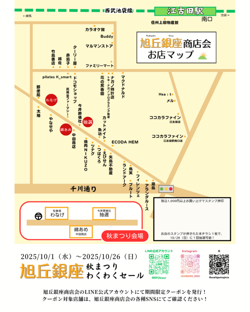 ① 10/1~10/26の期間中、商店会で1,000円以上お買い物してチラシの裏にスタンプをGET